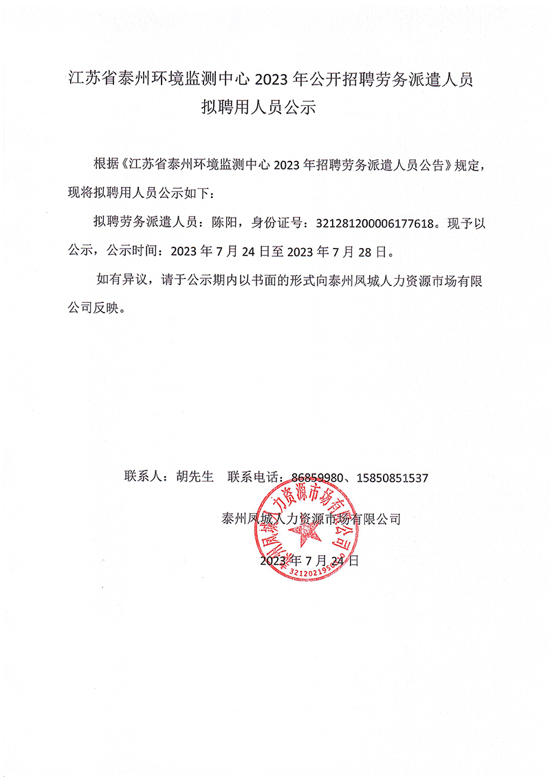 江蘇省泰州環(huán)境監(jiān)測(cè)中心2023年公開(kāi)招聘勞務(wù)派遣人員 擬聘用人員公示