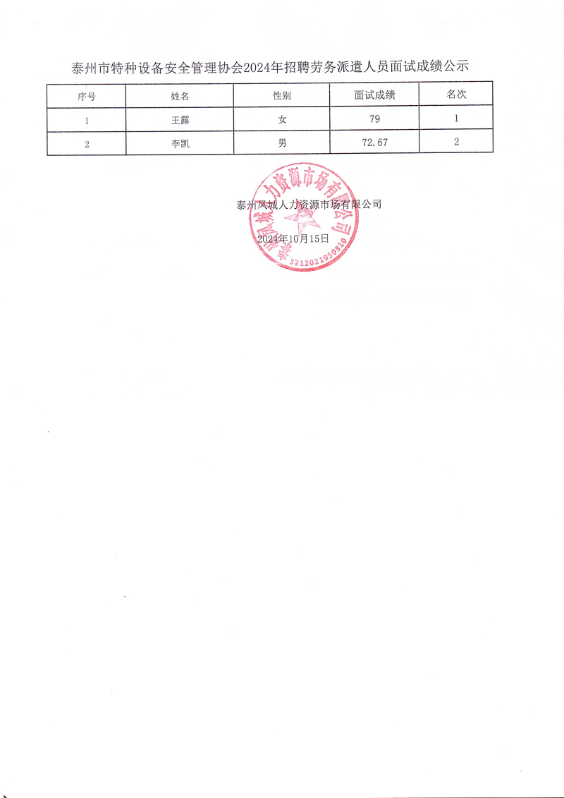 泰州市特種設(shè)備安全管理協(xié)會2024年招聘勞務(wù)派遣人員面試成績公示